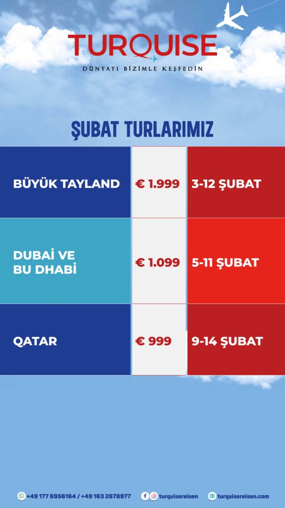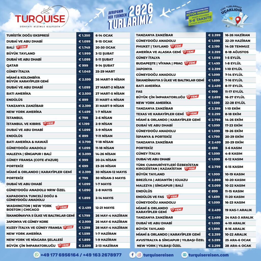 Turquise Reisen GmbH© şirketi Turizm sektörünün birçok dalında 35 yılı aşkın süredir yer almaktadır. Almanya'dan Turlar 2025 Turquisereisen farkıyla! Almanya çıkışlı turlar arasında Avrupa, Amerika, Asya ve özel rotalar için şimdi rezervasyon yaptırın, unutulmaz bir seyahat deneyimi yaşayın.