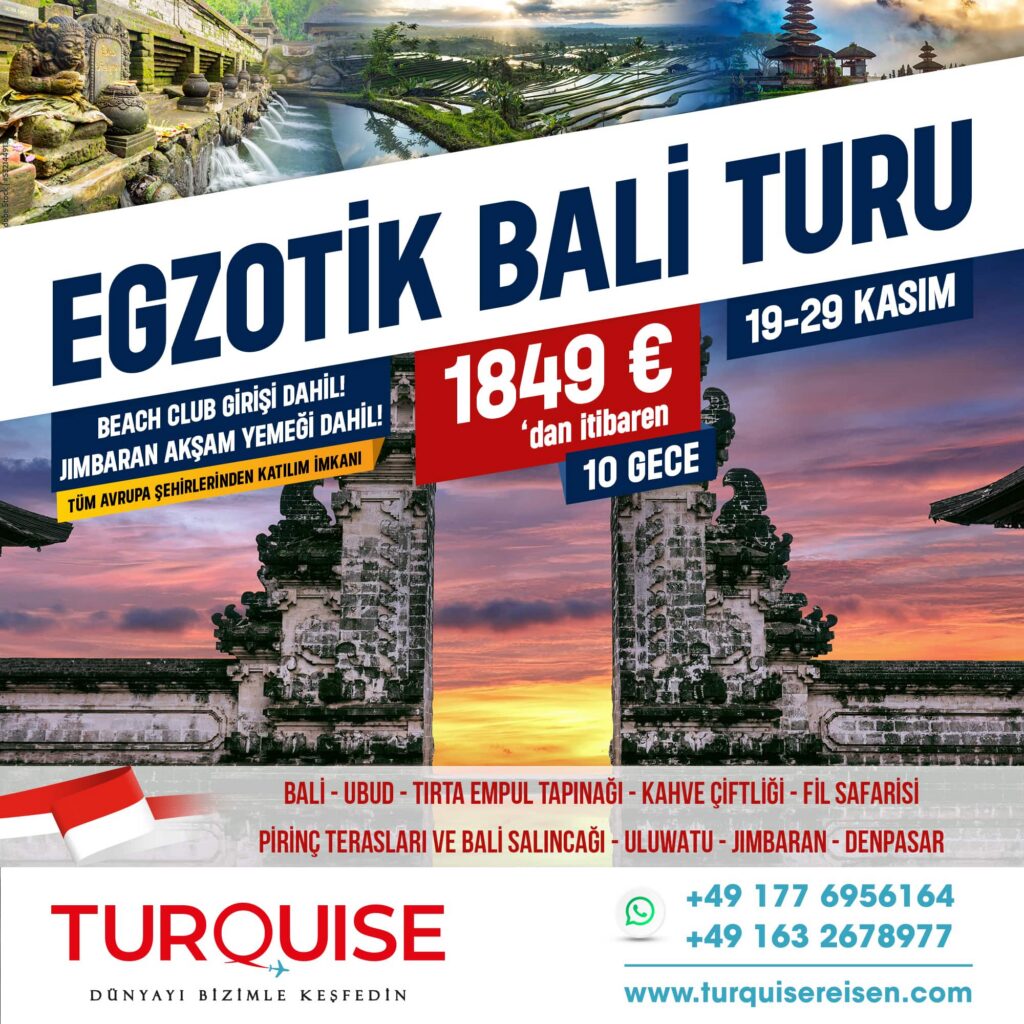 Bali – Ubud – Tirta Empul Tapınağı – Kahve Çiftliği – Fil Safarisi – Pirinç Terasları & Bali Salıncağı – Uluwatu – Jimbaran – Denpasar